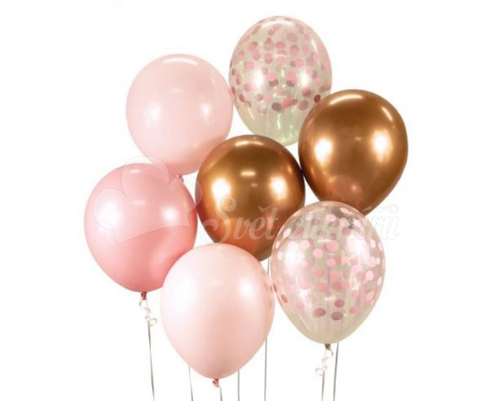Sada 7 latexových balónků včetně růžových a chromovaných s konfetovým potiskem, ideální pro výzdobu každé oslavy.