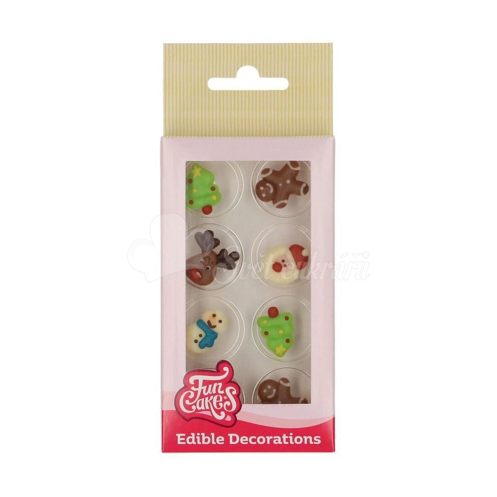 Čokoládové dekorace FunCakes dodávají cupcakes, dorty a další dobroty mimořádně krásné a lahodné. Vyrobeny z pravé belgické čokolády. Tato sada obsahuje 8 dekorací: vánoční stromečky, perníčky, soba, Ježíška a sněhuláka.