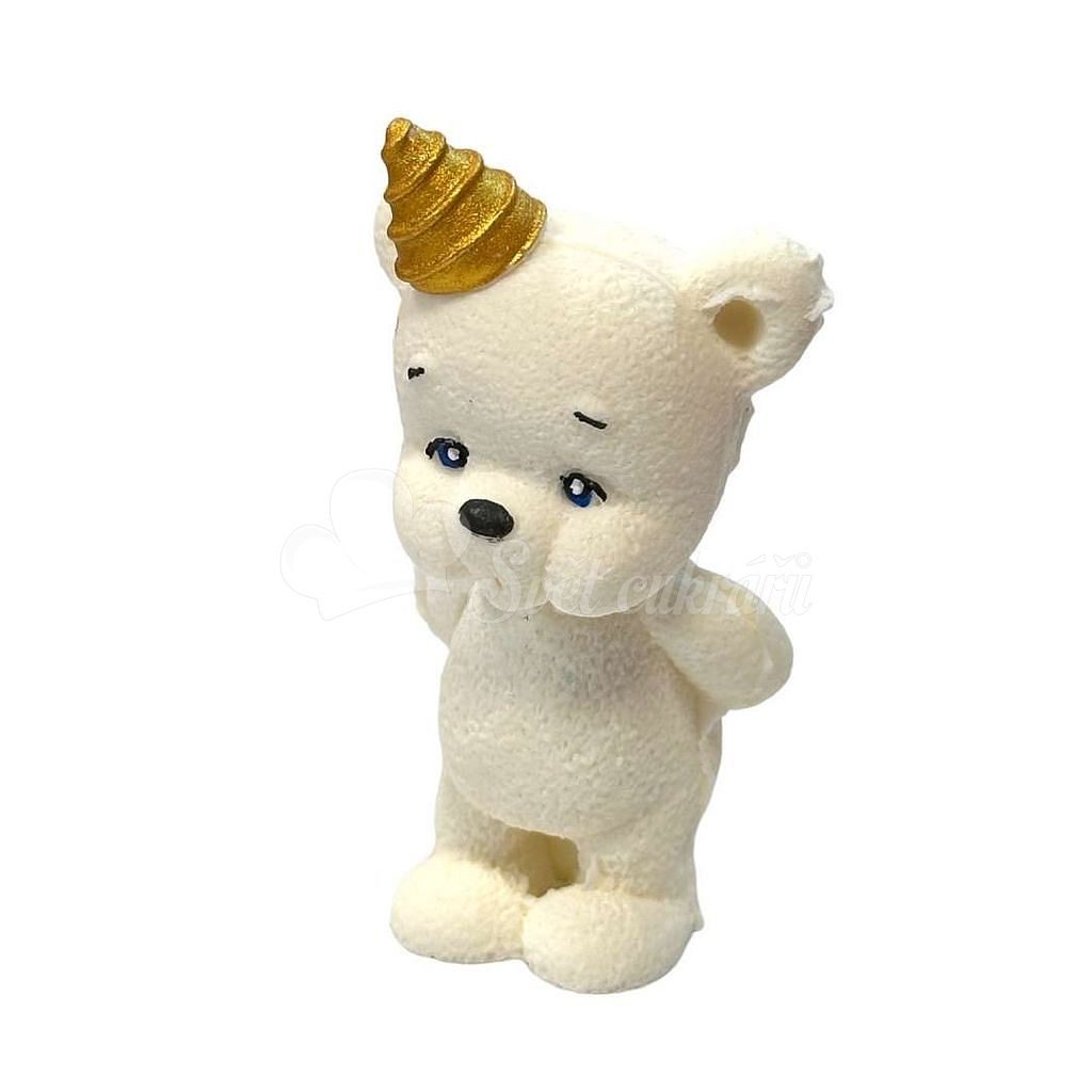 Čokoládová dekorace ve tvaru medvídka v hnědé barvě, s třpytkami „staré zlato“.