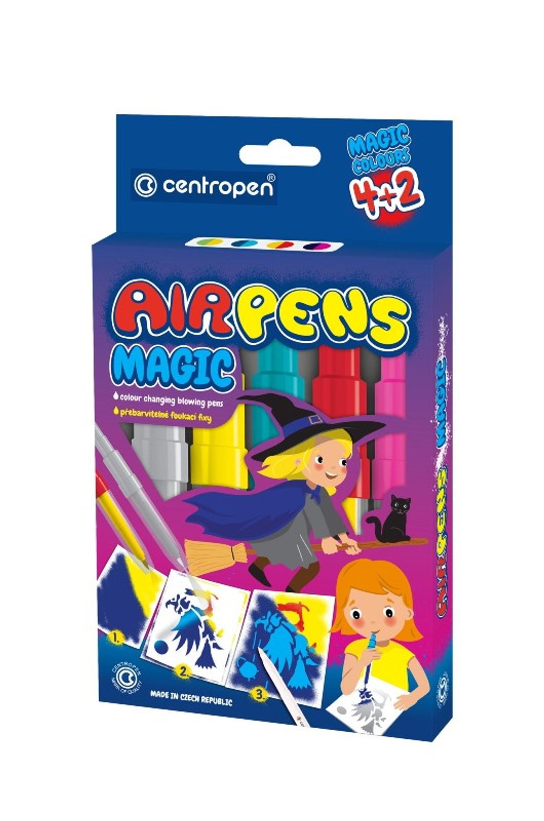 Foukací fixy 4+2 Magic. Magické foukací fixy na papír. Zdravotně nezávadný inkoust. Inkousty přebarvitelné zmizíkem. 4 přebarvitelné odstíny. 1 foukací a 1 klasický zmizík. 8 šablon.