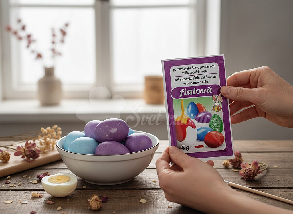 Prášková fialová barva určená k barvení velikonočních vajíček. Intenzivní odstín zajistí syté a rovnoměrné obarvení skořápek pro tradiční i moderní velikonoční výzdobu.