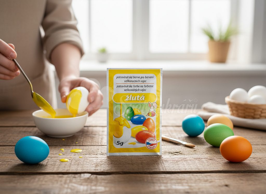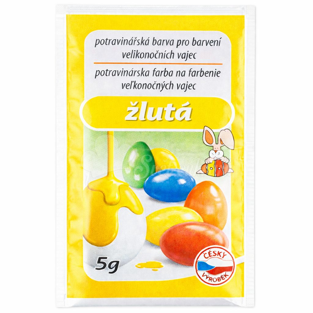 Prášková žlutá barva určená k barvení velikonočních vajíček. Intenzivní odstín zajistí syté a rovnoměrné obarvení skořápek pro tradiční i moderní velikonoční výzdobu.