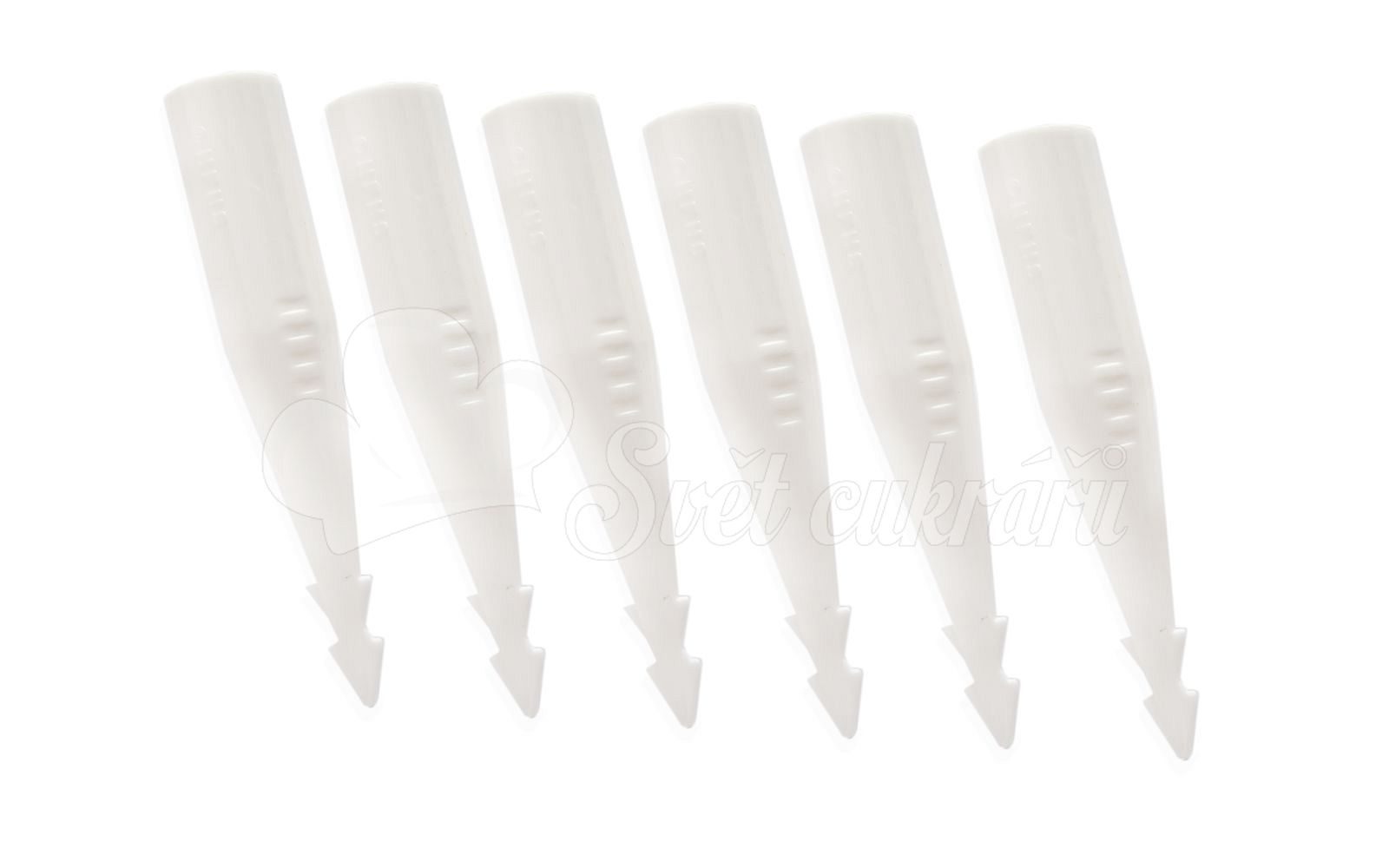 Do hrotů nalijte do poloviny čistou vodu. Umístěte dovnitř květy a hrot i s květy zapíchněte do dortu, tak aby horní část hrotu (cca 0,5 cm) zůstala nad dortem. Sada obsahuje 6 ks hrotů (váziček).